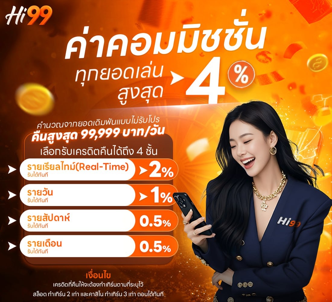 เพื่อเพิ่มความน่าสนใจ Hi99 ได้จัดโปรโมชั่นโบนัสรายวันที่หลากหลาย ตั้งแต่เครดิตฟรี โบนัสเติมเงิน ไปจนถึงเงินคืนยอดเสีย ทำให้ผู้เล่นได้รับประโยชน์สูงสุดจากการเดิมพัน ระบบฝาก-ถอนอัตโนมัติที่รวดเร็วและปลอดภัยช่วยอำนวยความสะดวกในการทำธุรกรรมตลอด 24 ชั่วโมง